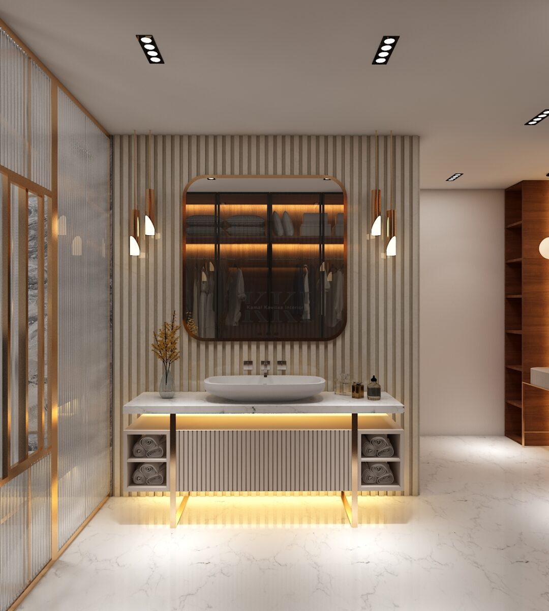 August 13, 2025Luxury master bathroom with walk-in closet area interior design by Kamal Kavita Interiors in jaipur with a rich and luxury material pallet and its gives a very modern and contemporary appeal to the space & even the space is designed with keeping mind the functionality as well which in turn makes it a great timeless ensuite for the luxury villa interior design and architecture by Kamal Kavita Interiors in jaipur, Rajasthan