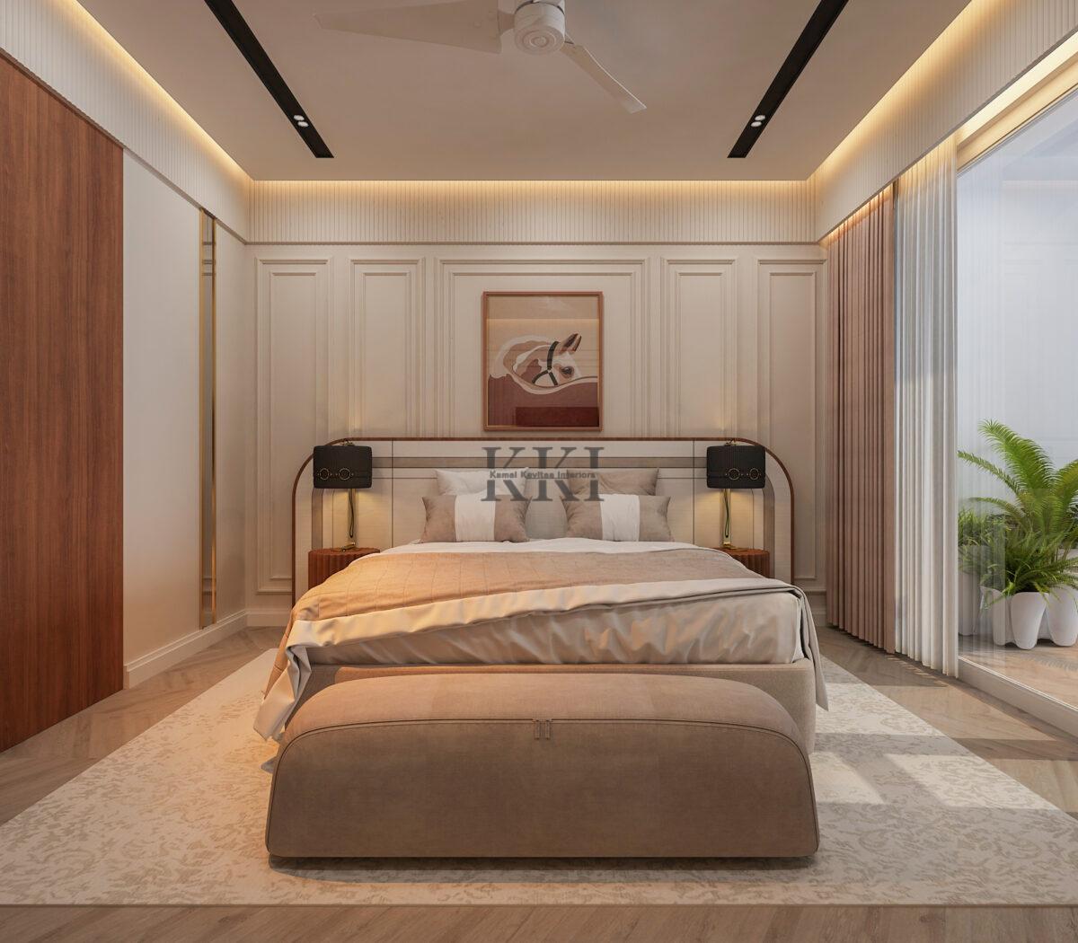 This Neoclassical style home interior design in Vaishali nagar, jaipur, rajasthan is the true blend of modern day home walking on lines of classical elegance to it, either it is the colour pallet or it is the wall art in form of mouldings its all in the blend together. The upholstery is so elegantly blending into the neutral colour pallet of the bedroom that it adds up elegance and style, cherry on the cake is the night stands addling glory to the whole style statement of the bedroom